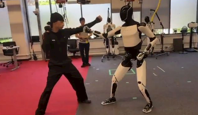 视频中,Optimus正跟随一名专业人士学习功夫动作。它并未简单模仿人类教练的招式,而是能够精准识别每一招式的意图,并做出相应的自卫与反击动作,展现出一定的环境感知与实时反应能力。